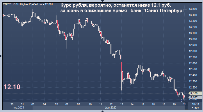Курс пары юань/рубль, вероятно, останется ниже уровня в 12,1 руб. за юань в ближайшее время, считают аналитики банка "Санкт-Петербург".