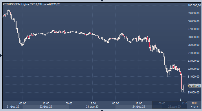 Во вторник в 7:25 по лондонскому времени цена биткоина составляла около 89 тысяч долларов, что стало минимальным значением с 18 ноября.