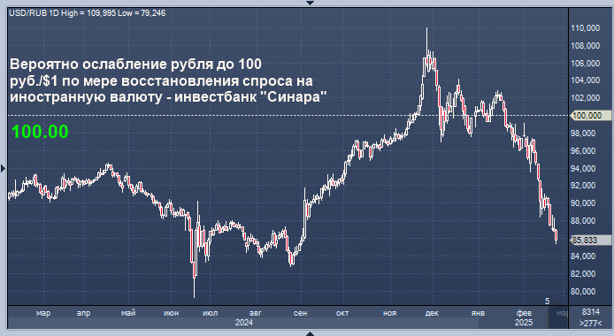 Вероятно ослабление рубля до 100 руб./$1 по мере восстановления спроса на иностранную валюту, полагает главный экономист инвестиционного банк "Синара" Сергей Коныгин.