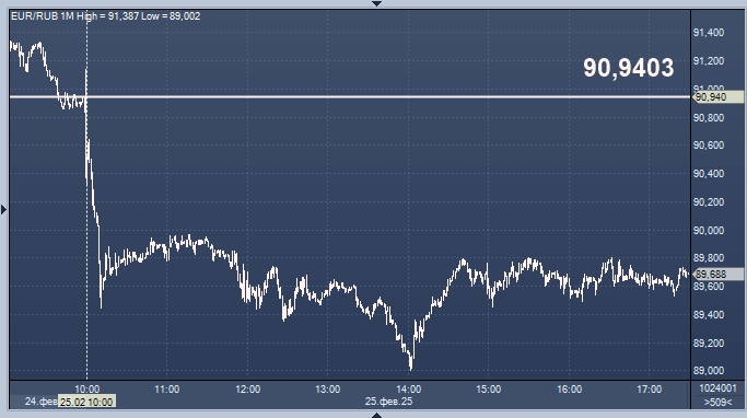 Банк России во вторник, 25 февраля, провел традиционный недельный депозитный аукцион, в ходе которого банки разместили в ЦБ РФ 1 трлн 840 млрд рублей (при лимите 1 трлн 840 млрд рублей и спросе 2 трлн 750,8 млрд рублей) в среднем по ставке 20,65% годовых. На предыдущем недельном депозитном аукционе, состоявшемся 18 февраля, банки разместили в ЦБ РФ 2 трлн 060 млрд рублей (при лимите 2 трлн 060 млрд рублей и спросе 3 трлн 198,8 млрд рублей) в среднем по ставке 20,76% годовых.