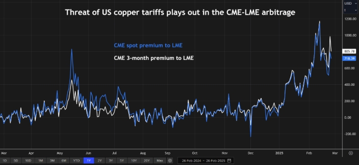 Премия за медь на CME по сравнению с Лондоном превысила 1000 долларов за метрическую тонну, когда Трамп в январе впервые упомянул этот металл в одном ряду с алюминием и сталью для рассмотрения введения тарифов.