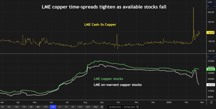 Спред цен между спотом и 3-месячной поставкой изменился с комфортного контанго более 100 долларов за тонну до бэквордации в 250 долларов за тонну 14 февраля и в настоящее время торгуется близко к нулю.