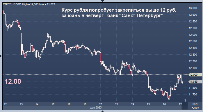 Курс валютной пары юань/рубль попробует закрепиться выше уровня в 12 руб. за юань на торгах в четверг, экспортеры уже должны были продать большую часть валюты, необходимой для уплаты февральских налогов, считают аналитики банка "Санкт-Петербург".