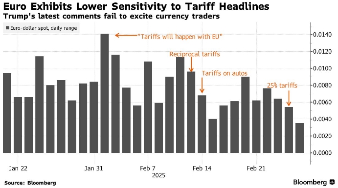 Евро демонстрирует меньшую чувствительность к новостям о тарифах. Последние комментарии Трампа не вызвали энтузиазма у валютных трейдеров. Спот евро-доллар, дневной диапазон. Заголовки новостей: «Тарифы будут введены против ЕС», взаимные тарифы, тарифы на автомобили, 25%-ные тарифы. Источник: Блумберг