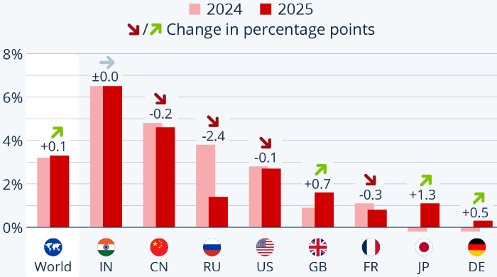МВФ: оценка изменения реального ВВП ряда стран в 2024 году и прогноз на 2025 год (цифры со стрелочками отражают изменение (в п.п.) относительно 2024 года). Источник: Statista