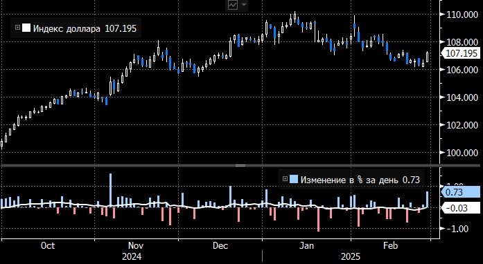 Индекс доллара вырос за день на 0,73%. Это самый большой внутридневной скачок с 3 февраля, когда доллар также вырос после первоначального объявления о введении пошлин в отношении Канады и Мексики, которые были позже отложены на 30 дней.
