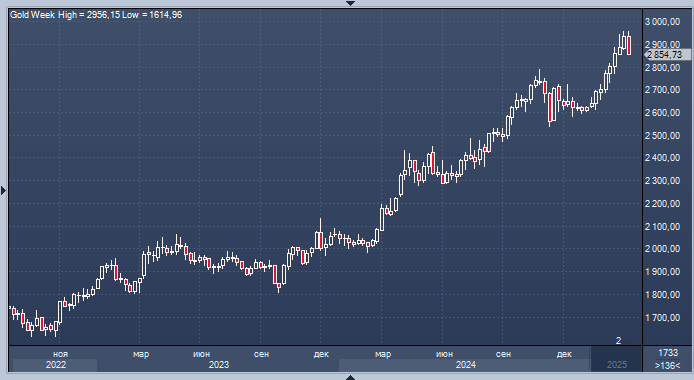 Фьючерсы на золото в США подешевели на 0,8%, достигнув 2 873,80 доллара.