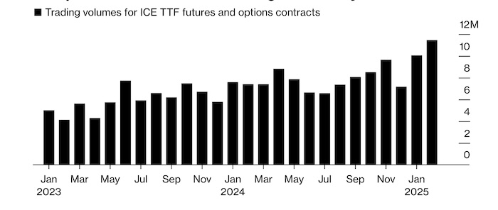 Объемы торгов европейским газом в феврале достигли рекордных значений. Источник: Bloomberg