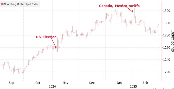 В пятницу доллар продолжил расти после напряженной встречи между Трампом и Владимиром Зеленским, которая привела к срыву мирного соглашения с Россией и потенциальной сделки по критически важным минералам. В интервью после перепалки в Овальном кабинете министр финансов Скотт Бессент подтвердил, что тарифы должны принести значительный доход.