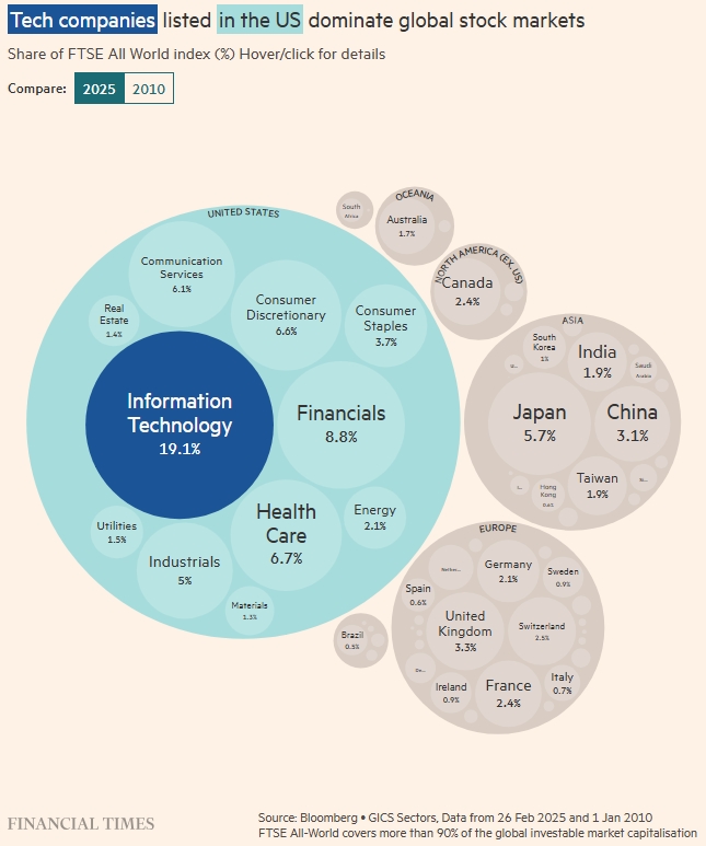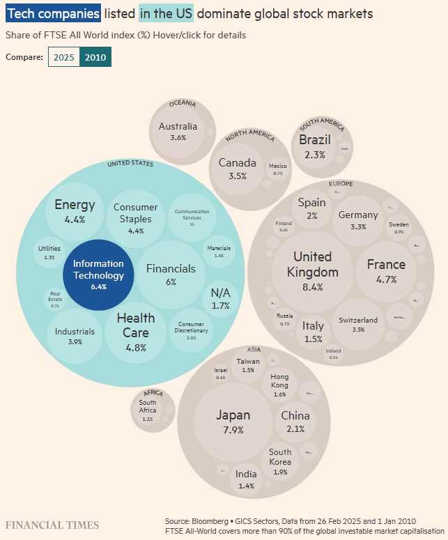 Технологические компании, зарегистрированные в США, доминируют на мировых фондовых рынках. Доля индекса FTSE All World (%). Financial Times. Источник: Bloomberg. Секторы GICS, данные с 26 февраля 2025 г. по 1 января 2010 г. FTSE All-World охватывает более 90% мировой инвестиционной рыночной капитализации