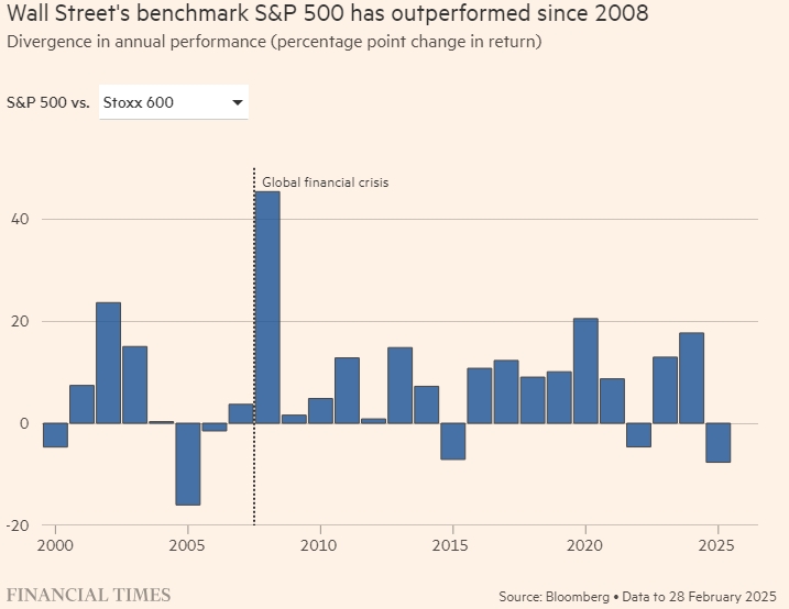 Индекс Уолл-стрит S&P 500 демонстрирует превосходные результаты с 2008 года. Расхождение в годовой результативности (изменение доходности в процентных пунктах). S&P 500 против. Стокс 600. FT. Источник: Bloomberg. Данные на 28 февраля 2025 г.