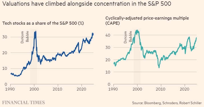 Цены акций выросли вместе с концентрацией в S&P 500. Доля акций технологических компаний в индексе S&P 500 (%). FT. Источник: Bloomberg, Schroders, Роберт Шиллер