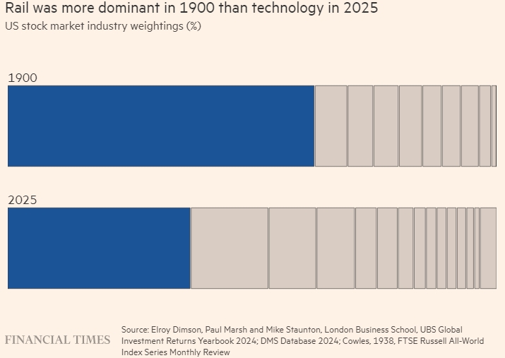 В 1900 году железнодорожный транспорт доминировал больше, чем технологии в 2025 году. Доля фондового рынка США в отраслевом весе (%). 1900 г. 2025 год. FT. Источник: Элрой Димсон, Пол Марш и Майк Стонтон, Лондонская школа бизнеса, UBS Global Investment Returns Yearbook 2024; База данных DMS 2024; Коулз, 1938, FTSE Russell All-World. Ежемесячный обзор индексной серии
