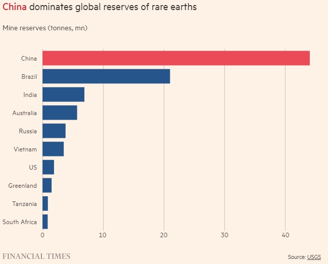 По данным Геологической службы США, на долю Китая приходится чуть менее половины мировых запасов редкоземельных металлов. Также значительные запасы этих металлов есть в Бразилии, Индии и Австралии.