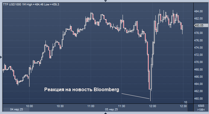 Биржевая цена природного газа в Европе (TTF, в евро за МВт-ч) интервалами 1 минуту