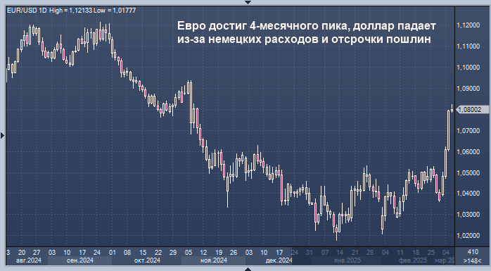 В четверг евро достиг четырёхмесячного максимума по отношению к доллару США, после того как доходность европейских облигаций резко выросла из-за предложенного Германией инфраструктурного фонда в размере 500 миллиардов евро (539,85 миллиарда долларов США) и пересмотра лимитов заимствований.
