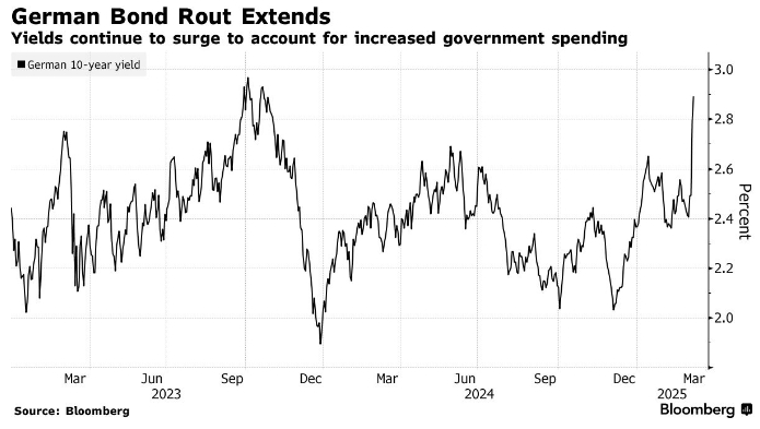 В среду стоимость немецких облигаций продолжила снижаться, а долговые рынки по всему миру испытали спад из-за исторического решения Берлина выделить сотни миллиардов евро на оборону и инфраструктуру.