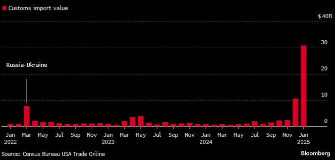 США импортировали рекордные 329,5 млрд долларов всех видов товаров в январе 2025 года, на $36 млрд больше, чем в предыдущем месяце, показали данные Министерства торговли в четверг, 6 марта. На импорт готовой продукции в металлических формах, а эта категория включает слитки драгоценных металлов, пришлось почти 60% ежемесячного прироста импорта товаров.