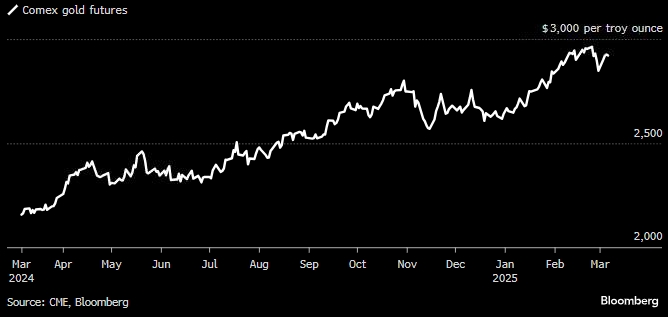 Недавний поток импорта золота в США был в значительной степени ответом на возросшие опасения, что драгоценный металл может попасть под импортные пошлины США. Также этому способствовали покупки в качестве безопасного актива, фьючерсы на золото в Нью-Йорке приблизились к отметке в 3000 долларов за унцию.
