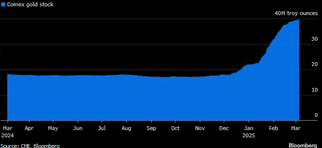 Данные депозитария Comex указывают, что запасы золота выросли на 121% с конца ноября и в настоящее время составляют почти 40 миллионов унций, что является самым высоким показателем с 1992 года. Большая часть золота, которое было срочно доставлено в Нью-Йорк, поступила из Лондона, крупнейшего в мире торгового центра для физическим золотом.