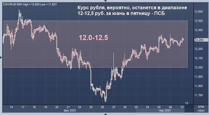 Курс валютной пары юань/рубль, вероятно, останется в диапазоне 12-12,5 руб. за юань на торгах в пятницу, считает управляющий эксперт Центра аналитики и экспертизы Промсвязьбанка (ПСБ) Денис Попов.