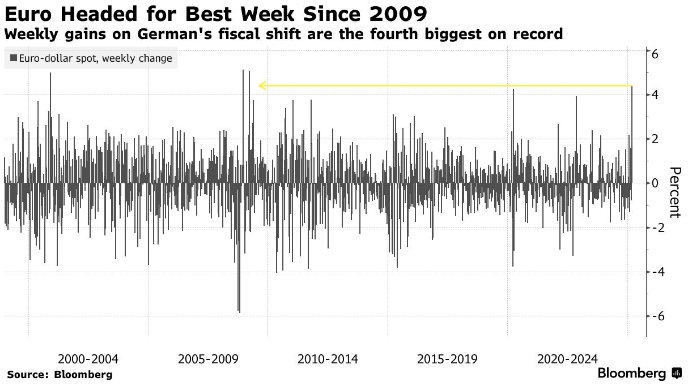 Евро демонстрирует лучшую недельную динамику за последние 16 лет после того, как Германия объявила о планах увеличить расходы на оборону и инфраструктуру.