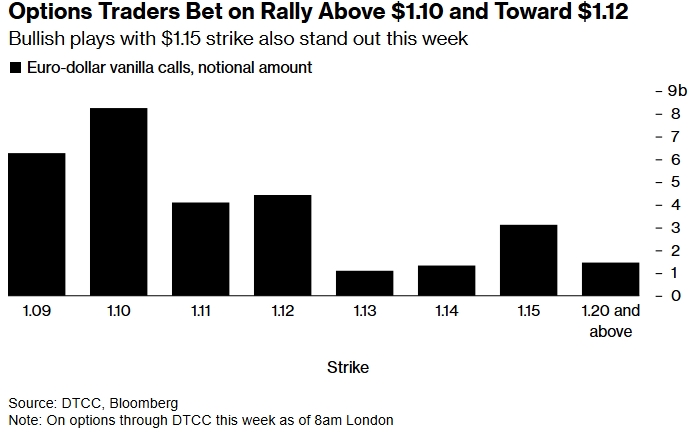 Опционные трейдеры делают ставку на ралли выше $1,10 и к $1,12. На этой неделе также выделяются бычьи стратегии со страйком $1,15. Источник: DTCC, Bloomberg. Примечание: по опционам через DTCC на этой неделе по состоянию на 8 утра по лондонскому времени