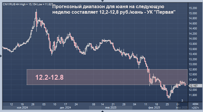 Прогнозный диапазон для юаня на следующую неделю составляет 12,2-12,8 руб./юань, для пары доллара - 89-93 руб./$1, говорится в комментарии аналитика УК "Первая" Натальи Ващелюк.