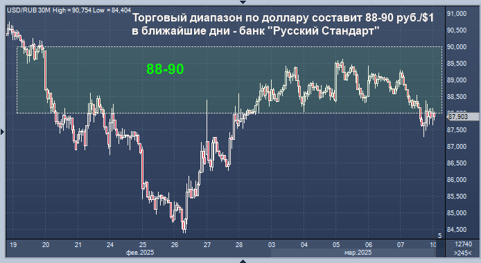 Торговый диапазон по паре рубль/доллар, скорее всего, составит в ближайшие дни 88-90 руб./$1, по паре рубль/евро - 96-98 руб./EUR1, полагает директор департамента операций на финансовых рынках банка "Русский Стандарт" Максим Тимошенко.