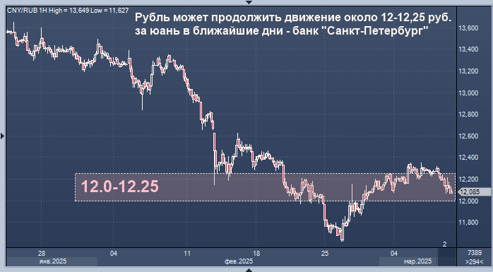 Курс валютной пары юань/рубль в целом может продолжить движение вблизи уровней 12-12,25 руб. за юань в ближайшие дни, считают аналитики банка "Санкт-Петербург".