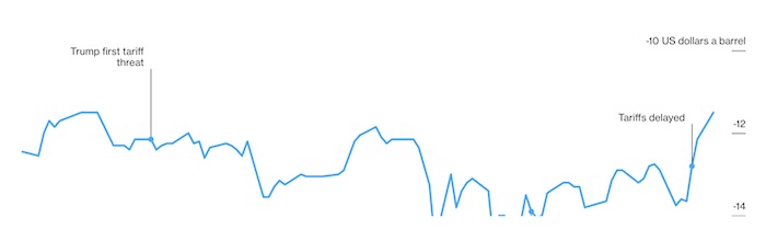 Согласно ценам General Index, собранным Bloomberg, в понедельник стоимость барреля канадской нефти марки Select с поставкой в апреле была на $11.50 ниже стоимости американского эталона West Texas Intermediate. Это самый низкий дисконт с 15 ноября, до того как Трамп — тогда избранный президент — впервые пригрозил тарифами на канадский импорт.
