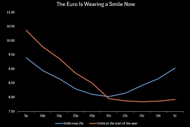 На рубеже года улыбка волатильности EUR/USD — графическое представление подразумеваемой волатильности для группы опционов с одинаковыми сроками действия — показала отчетливый перекос. Тогда преобладающим нарративом было то, что любые торговые пошлины, введенные Белым домом, могут негативно повлиять на экономику Европейского союза и отправить евро на паритет. В соответствии с этим графиком трейдеры делали ставки на пут-опционы, сильно находящиеся вне денег, и были равнодушны к колл-опционам (оранжевая линия на графике).