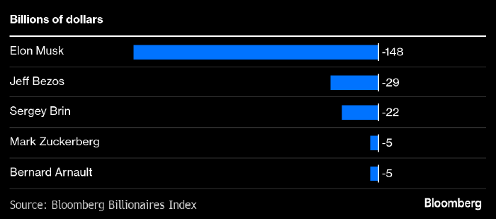 Состояние Илона Маска достигло пика в $486 млрд 19 декабря, после чего в период с 17 января по 10 марта снизилось на $148 млрд. Состояние Джеффа Безоза снизилось на $29 млрд, Сергея Брина — на $22 млрд, а Марк Цукерберг и Бернар Арно потеряли по $5 млрд.