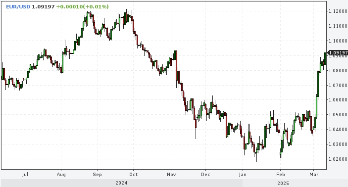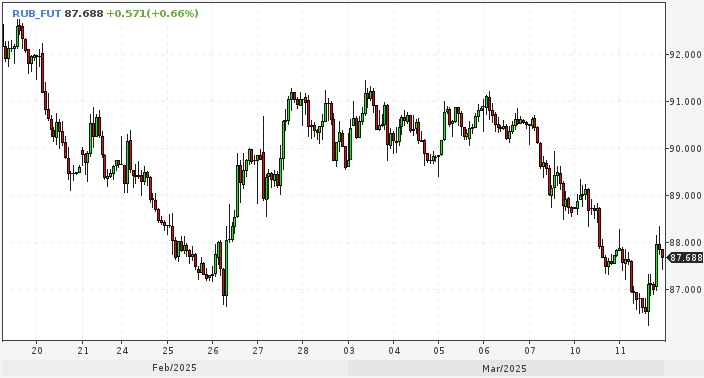 Евро достиг пятимесячного максимума во вторник, 11 марта, после того как Украина согласилась на 30-дневное предложение о прекращении огня. Фьючерсы на курс доллар/рубль снизились до нового минимального значения с августа 2024 года, но затем отскочили вверх на фоне коррекции.