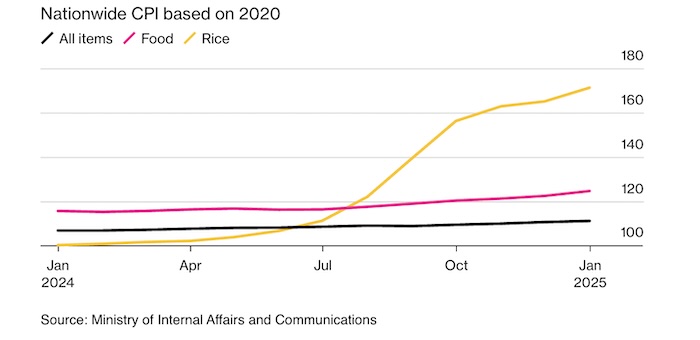 Япония выделяется на общем фоне. В мире цены на рис падают, азиатский эталонный показатель недавно упал до самого низкого уровня с 2022 года. Глубоко укоренившиеся предпочтения отечественного риса, высокие тарифы на зарубежный рис и запутанная цепочка поставок в стране не дали импорту снизить цены.