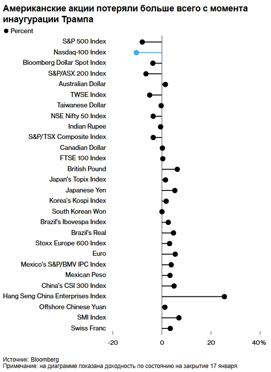 Особенно сильно пострадали акции США после вступления Трампа в должность 20 января. Индекс S&P 500 упал примерно на 8%, а индекс Nasdaq 100 — более чем на 10%.