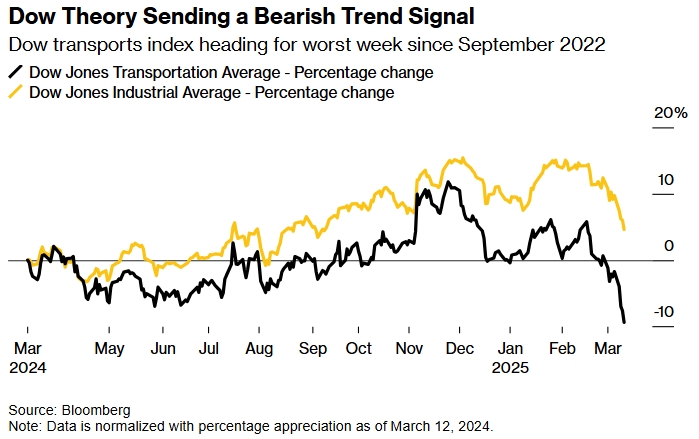 Теория Доу подает сигнал о медвежьем тренде. Индекс Dow Transportation готовится к худшей неделе с сентября 2022 года. Источник: Bloomberg. Примечание: данные нормализованы с учетом процентного роста по состоянию на 12 марта 2024 года.