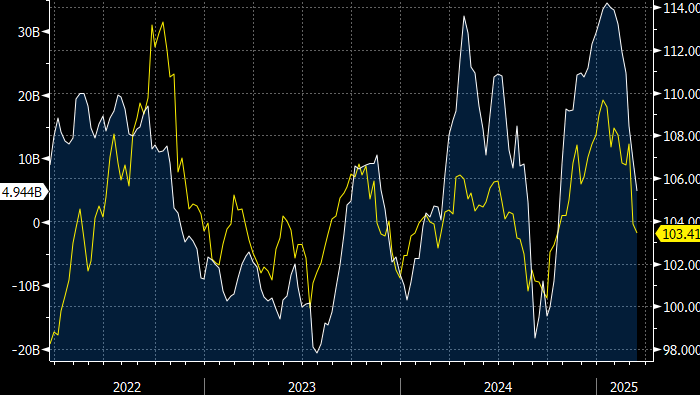 Белым — объем чистой длинной спекулятивной позиции по доллару (млрд USD, левая шкала), желтым — индекс доллара DXY (правая шкала) интервалами 1 неделя