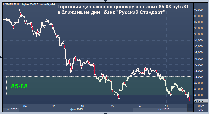 Торговый диапазон по доллару, скорее всего, составит в ближайшие дни 85-88 руб./$1, по евро - 92-95 руб./EUR1, полагает директор департамента операций на финансовых рынках банка "Русский Стандарт" Максим Тимошенко.
