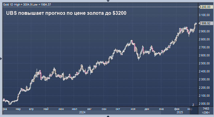 UBS присоединился к ряду других банков, которые в последние недели подняли свои целевые цены на жёлтый металл. На прошлой неделе Macquarie Group прогнозировала, что цены вырастут до 3500 долларов за унцию во втором квартале. BNP Paribas SA повысила свой прогноз, показывая средние цены значительно выше 3000 долларов.