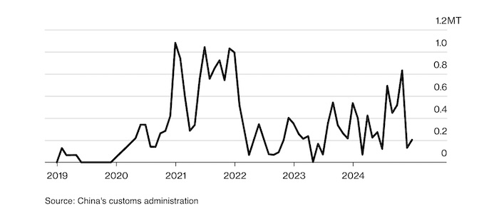 Согласно данным отслеживания судов, собранным Bloomberg, это самый продолжительный период без поставок с июня 2023 года. В настоящее время также нет американских поставок, направляющихся в Китай, по данным отслеживания судов от аналитической фирмы Kpler.