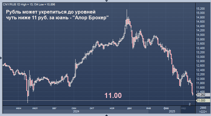 Рубль может укрепиться по отношению к юаню до уровней чуть ниже 11 руб. за юань в ближайшее время, считает руководитель направления инвестиционного консультирования "Алор Брокера" Алексей Антонов.