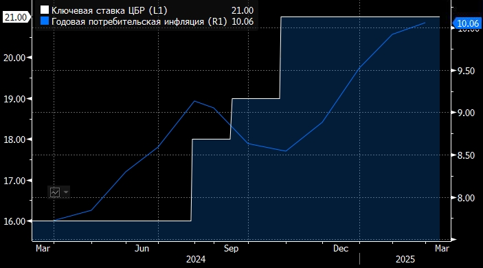 ЦБ ожидает ускорения годовой инфляции в России на конец марта до 10,6%