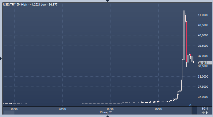 Турецкая лира упала в цене по отношению к доллару на 13%, после чего скорретировала до половины обвала, а базовый индекс страны Bist 100 снизился почти на 7% в начале торгов после задержания Имамоглу. Суверенные 10-летние облигации упали, в результате чего доходность выросла на 175 базисных пунктов до 29,94%.