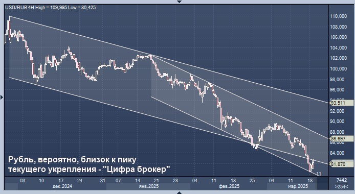 Национальная валюта еще может показывать сильные импульсные движения, однако рубль, вероятно, близок к пику своего укрепления в текущем цикле, считают аналитики инвестиционной компании "Цифра брокер".