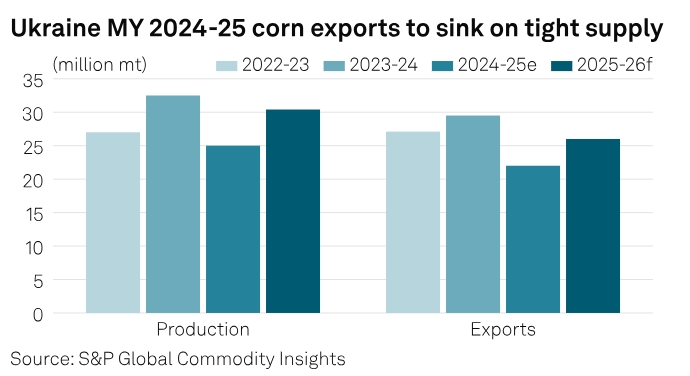 Аналитики S&P Global прогнозируют, что в связи со снижением производства кукурузы в прошлом сезоне экспорт кукурузы из Украины достигнет 22 млн тонн в 2024–2025 МГ.