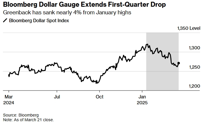 Настроения быстро изменились, когда доллар упал на 2,3% в первую неделю марта. Неопределённость, вызванная тарифами, усилилась в то время, когда возросшие расходы на оборону в Европе повысили стоимость единой валюты по отношению к доллару.