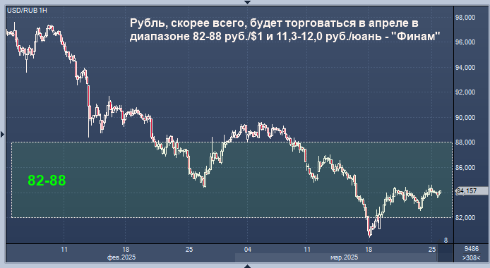 Рубль, скорее всего, будет торговаться в апреле в диапазоне 82-88 руб./$1, 90-96 руб./EUR1 и 11,3-12,0 руб./юань, прогнозирует аналитик "Финама" Александр Потавин.
