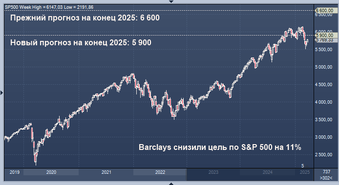 Аналитики под руководством Вену Кришны понизили прогноз по S&P 500 на 2025 год с 6 600 до 5 900. Они также уменьшили базовую оценку прибыли на акцию с 271 до 262 долларов.