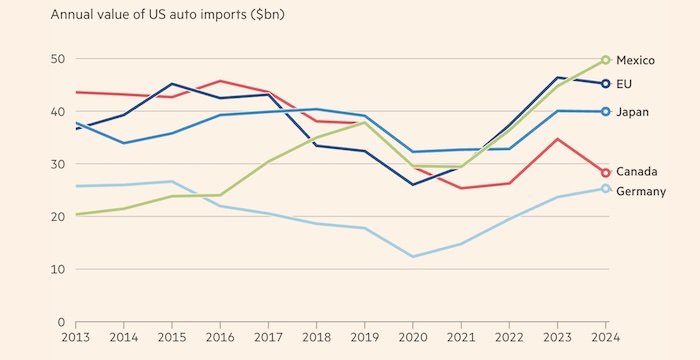 Больше всего автомобилей ввозится в США из Мексики. В 2024 году она отправила через границу 2,77 млн автомобилей, подавляющее большинство без тарифов в рамках USMCA. Министр экономики Мексики Марсело Эбрард находился в Вашингтоне в среду для встречи с министром торговли Говардом Лутником.